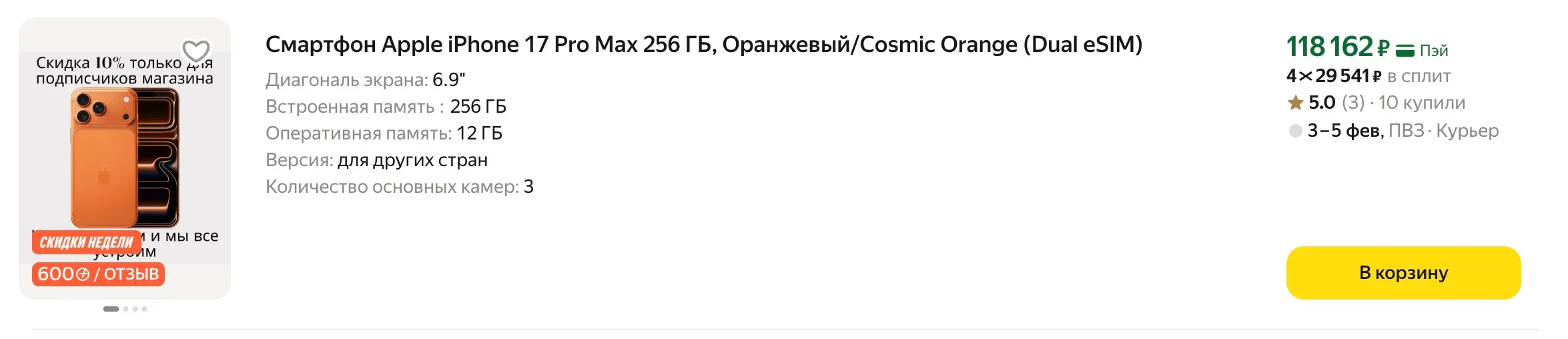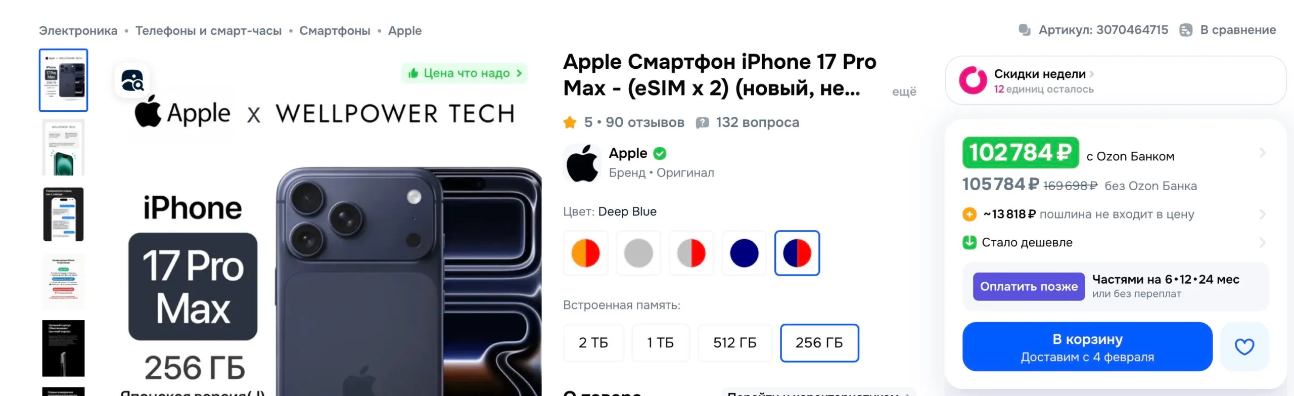 По данным Hi-Tech Mail.ru, 17 Pro Max можно взять за 102 тысячи рублей. Это и правда так — на Ozon есть лоты за 102,7 тысяч рублей. Но этот вариант с доставкой из-за рубежа и пошлиной 13,8 косарей. В сумме получается почти 117 косарей + пара недель ожидания.