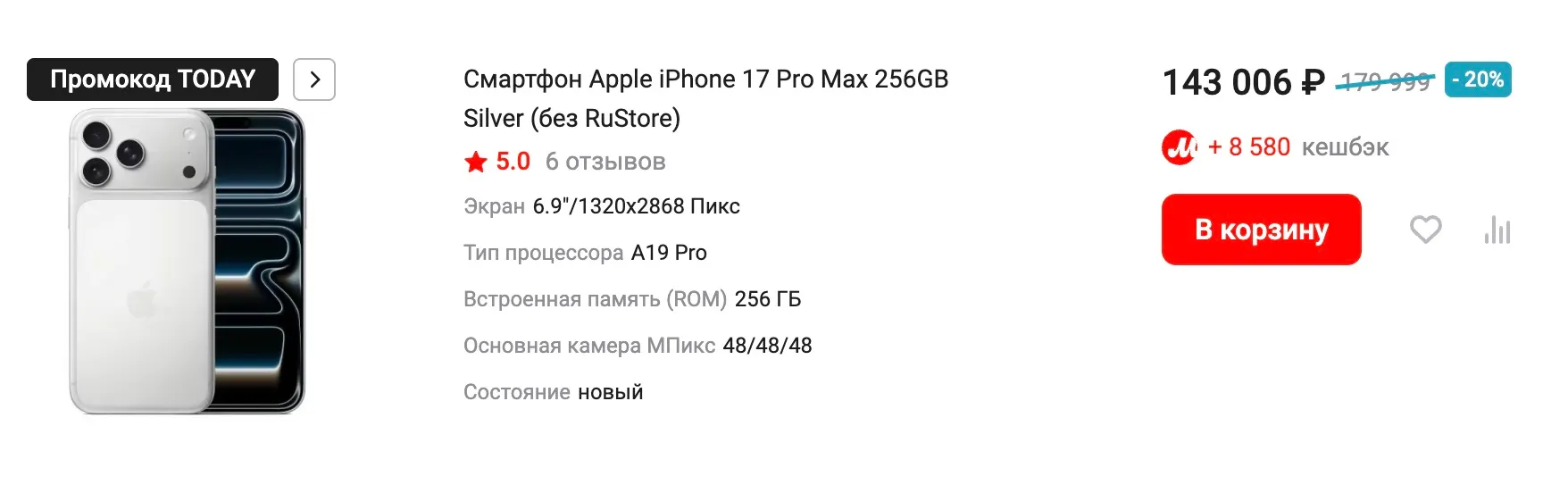 Дешевле 100К iPhone 17 Pro Max точно стоить не будет — это наш прогноз. Так что можно смело брать смарт за 110-120 тысяч рублей.