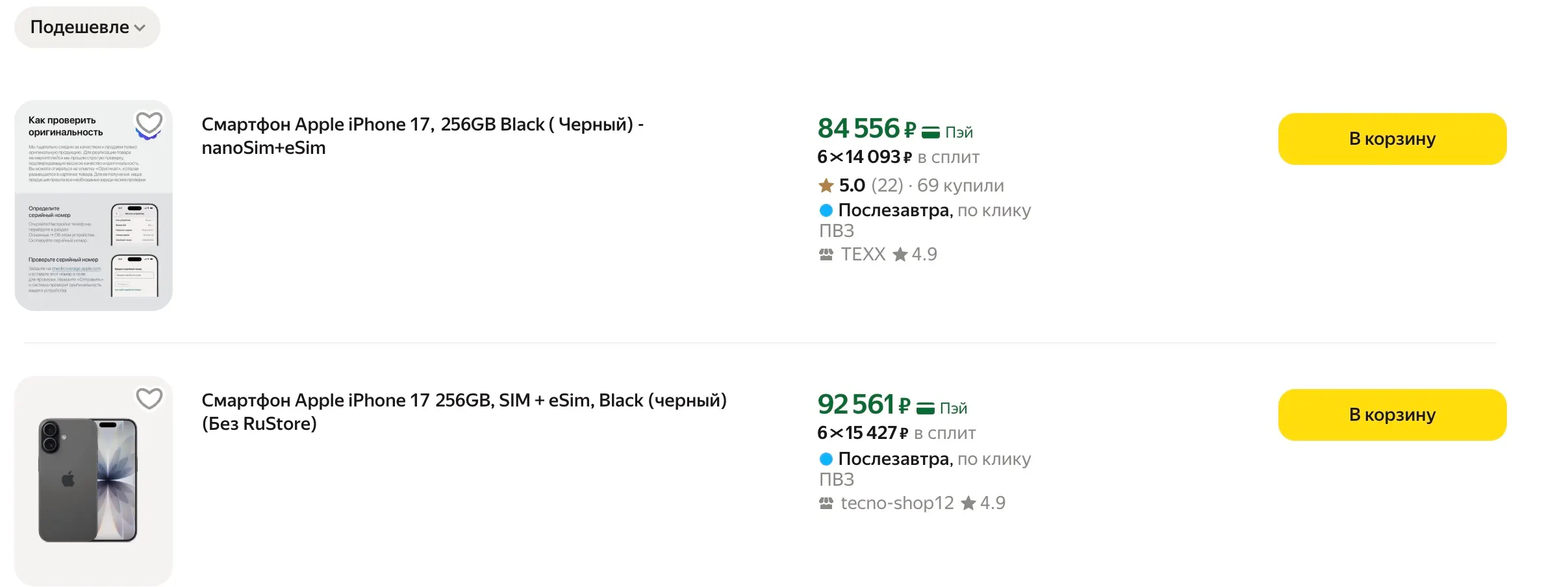 Поэтому сейчас 84,5 тысяч рублей за iPhone 17 не кажутся огромными деньгами. Хотя, если вы найдете скидку, или Маркет предложит вам выгодный индивидуальный прайс или рассрочку на смартфон, будем только рады.