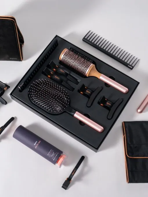 Ещё у Dyson есть наборы расчёсок, держатели и подставки для фенов и чехлы с индивидуальной гравировкой. Первые два типа могут стать приятными бонусами любой владелице гаджета этого бренда. Последние можно получить только при покупке в официальном бренд-магазине Dyson, но для этого придётся слетать в Казахстан или ОАЭ (просто примеры).