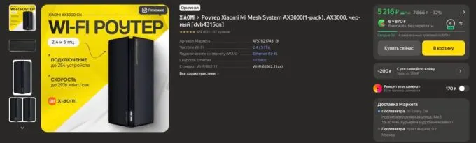 Прямо сейчас на Яндекс Маркете топовый роутер Xiaomi AX3000 можно урвать за 5216 рублей. Также не забывайте, что многие банки готовы отсыпать кэшбек за покупки на этой платформе.