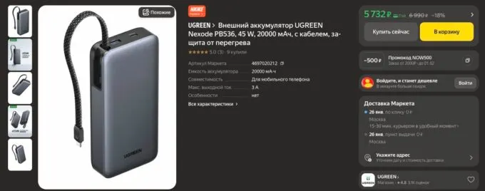Прямо сейчас новый пауэрбанк Ugreen Nexode PB536 можно приобрести на Яндекс Маркете всего за 5732 рубля. А с кэшбеками некоторых банков она обойдётся ещё дешевле.