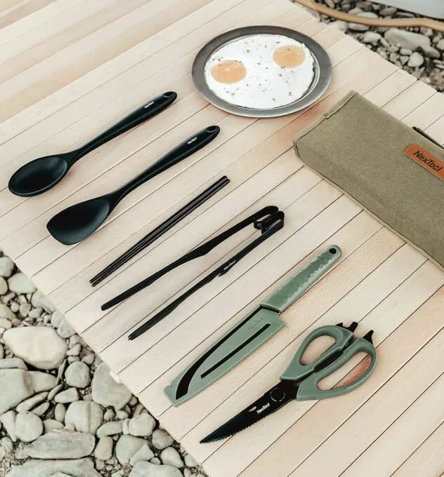 Набор NexTool Outdoor Cooking Set создан ровно для одного сценария — готовки в полевых условиях. В одном компактном кейсе собраны нож, ножницы, щипцы, ложка, лопатка и палочки. Все инструменты выполнены из стали и термостойкого силикона. Они не боятся огня, грязи и активного использования. Поэтому можно развести костёр и готовить прямо на нём.