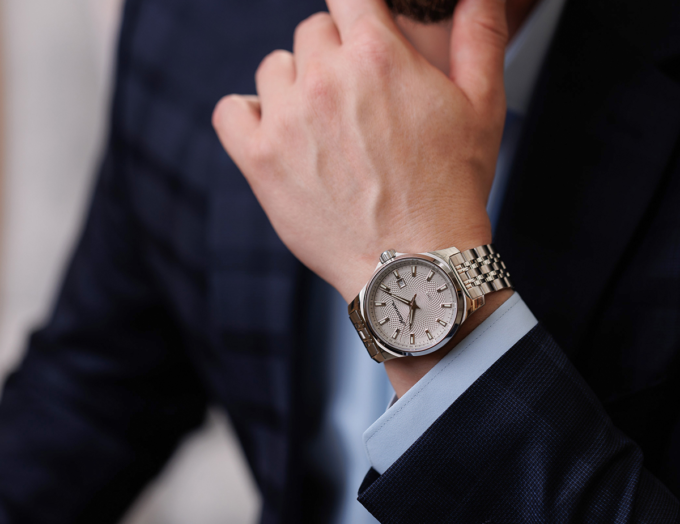 «Гранд» — более массивная и премиальная модель с акцентом на детали и визуальную глубину. Под сапфировым стеклом с антибликовым покрытием расположен циферблат с двумя типами гильоше, которые красиво играют на свету. Тонкие стрелки Baton и объёмные индексы с покрытием Super-LumiNova обеспечивают отличную читаемость и добавляют часам солидности.