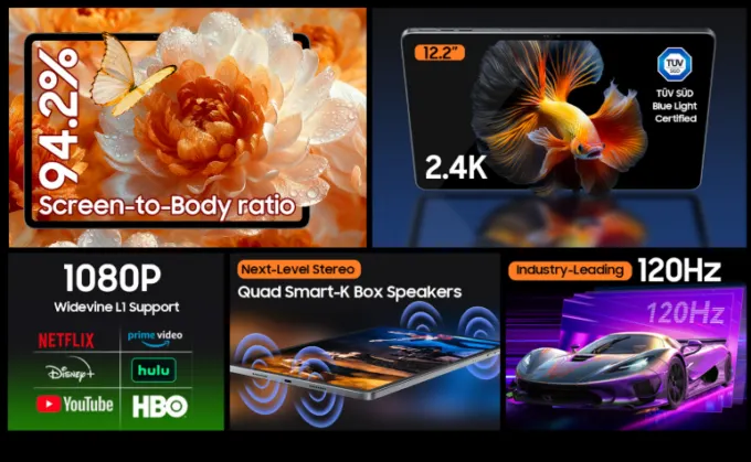 Устройство вышло с 12,2-дюймовым IPS-экраном с разрешением 2,4К и частотой 120 Гц. Рамки очень тонкие — дисплей занимает больше 94% площади передней панели. Смотреть видео, фильмы и сериалы комфортно — у девайса есть 4 стереодинамика.