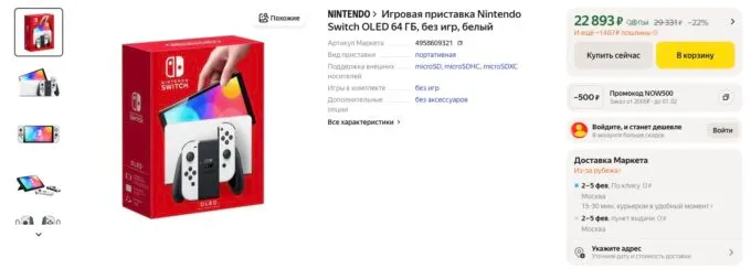 Прямо сейчас на Яндекс Маркете топовую консоль Nintendo Switch OLED можно купить всего за 24 360 рублей (с учётом пошлины). А с кэшбеками некоторых банков она обойдётся ещё дешевле.