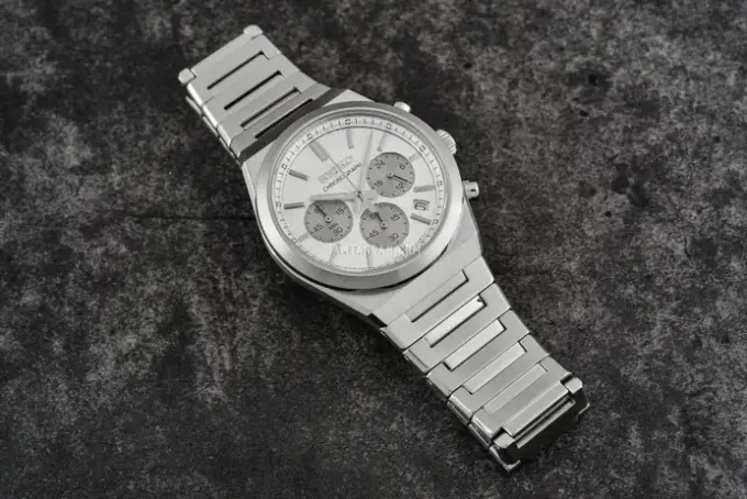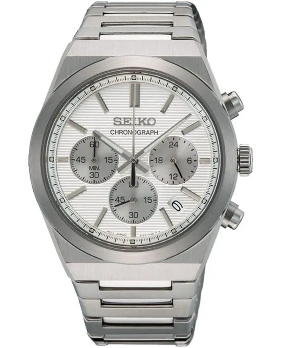 Хронограф с премиальным дизайном и функциональностью от Seiko — CS Sport SSB451P1 — выглядит максимально престижно. Тахиметрическая шкала, окошко даты и стрелки с покрытием LumiBrite обеспечивают стильный и современный вид, а оттенок корпуса под «натуральный титан» и полосатый циферблат добавляют люксовости. Дизайн явно напоминает хайповые AP, но при этом часы остаются уникальными и узнаваемыми.