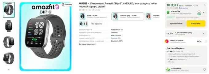 Cейчас стильные часы Amazfit Bip 6 можно урвать на Яндекс Маркете всего за 10 037 рублей. Также не забывайте, что многие банки готовы отсыпать кэшбек за покупки на этой платформе.