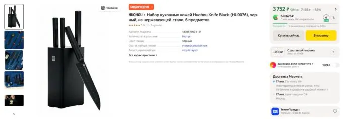 Прямо сейчас на Яндекс Маркете шикарный набор кухонных ножей Xiaomi HuoHou Kitchen Knife Set можно урвать всего за 3752 рубля, а с кэшбеком некоторых банков он обойдётся ещё дешевле.
