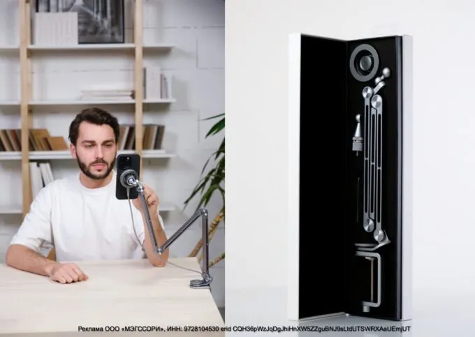 Чем ещё хорош Magssory Arm? Во-первых, диапазон регулировок и углов наклона довольно широкий — для горизонтальной и вертикальной ориентации экрана можно вращать условный iPhone на 360 градусов. Во-вторых, конструкция очень прочная и устойчивая. Корпус выполнен из алюминия, петли усилены и выдерживают нагрузку до 3 кг, так что даже планшет будет держаться максимально крепко. В-третьих, с совместимостью всё в порядке — держатель подойдёт для смартфонов с MagSafe или с магнитными чехлами. Плюс в комплекте есть специальная насадка-держатель для микрофона, а также магнитный стикер, который можно прикрепить к планшету, электронной книге или портативному монитору — снова респектуем за универсальность.