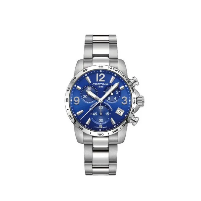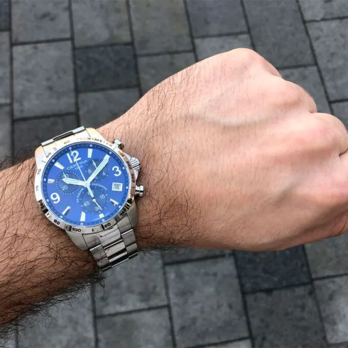 Ещё один представитель швейцарской часовой индустрии — Certina DS Podium Chronograph C034.417.11.047.00. Это классический спортивный хронограф с серьёзным запасом прочности. Синий циферблат с крупными метками отлично читается при любом освещении, а стальной корпус усилен фирменной технологией DS Concept, повышающей устойчивость к ударам и нагрузкам. Дополняют конструкцию сапфировое стекло и герметичная заводная головка.