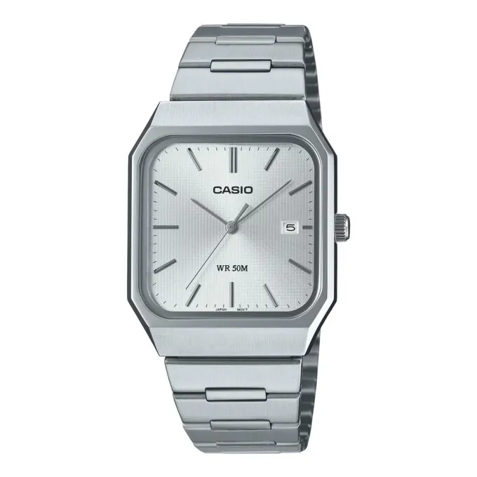 Подборку открывает японская классика. Casio Collection MTP-B185D-7A — аккуратные часы с прямоугольным стальным корпусом и серым циферблатом, которые создают эффект монохрома, что моментально придаёт х10 к прайсу. Минималистичные метки, строгая геометрия и сдержанный дизайн делают модель универсальной — она одинаково органично смотрится и с костюмом, и с джинсами и худи. Завершает образ окошко даты на 3 часах. Практично, но без визуального шума.