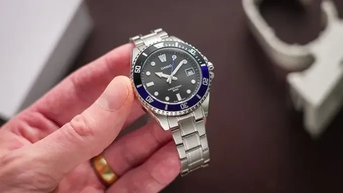 Модель с ярко выраженной эстетикой дайверских часов, которая моментально считывается как люкс. И, нет, это не рофл — Casio Collection Standard MDV-10D-1A2 действительно напоминают Rolex GMT Master II Batman. Чёрно-синий безель, аккуратный циферблат и массивный стальной браслет формируют образ премиальной модели. Стрелки и метки покрыты необритовым напылением, поэтому время отлично видно даже ночью.