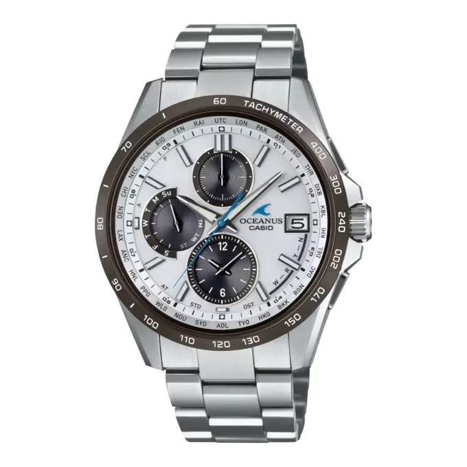 В Casio Oceanus OCW-T2600J-7A установлена солнечная батарея Tough Solar, сапфировое стекло с антибликом и хронограф с секундомером 1/20. На метках и стрелках есть необритовое покрытие, которое улучшает читаемость в темноте. Титановый корпус с карбидным слоем отвечает за лёгкость и прочность, а литой браслет с тройной застёжкой добавляет ощущение монолитности. Влагозащита в 100WR позволяет без проблем использовать часы в воде, даже в океанической, но без экспериментов уровня Жак-Ива Кусто.