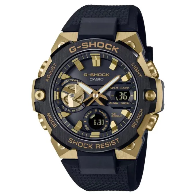 Casio G-Shock GST-B400-1A9 — представитель премиальной линейки G-Steel. Тонкие, жёсткие и заметно более статусные часы, чем классические «джишоки». Карбоновая конструкция Carbon Core Guard делает корпус прочным без лишней массивности, а золотые акценты на чёрном фоне выглядят максимально эффектно.