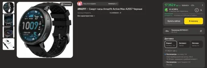 В Европе Amazfit Active Max оценили в 170 евро, но уже сейчас на Яндекс Маркете будущий хит можно урвать всего за 17 362 рубля. Также не забывайте, что многие банки готовы отсыпать щедрый кэшбек за покупки на этой платформе.