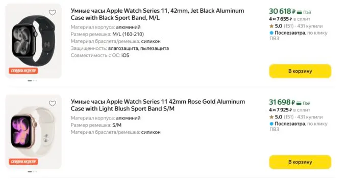 - Apple Watch 11 — от 30 600 рублей (было 38 600 рублей)