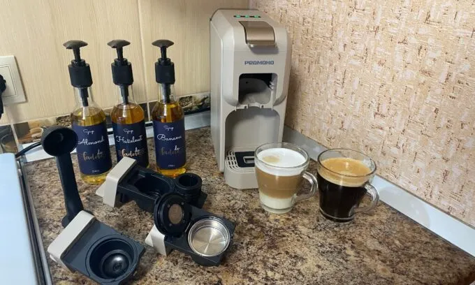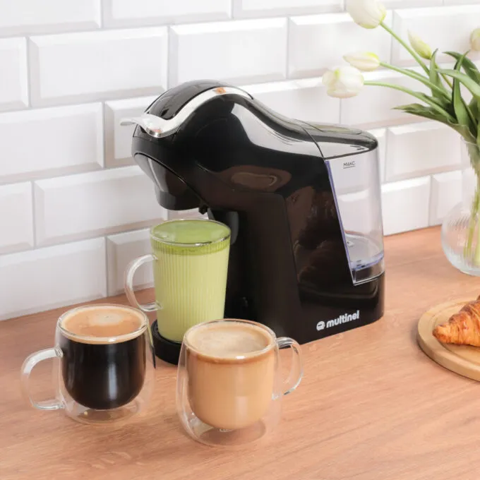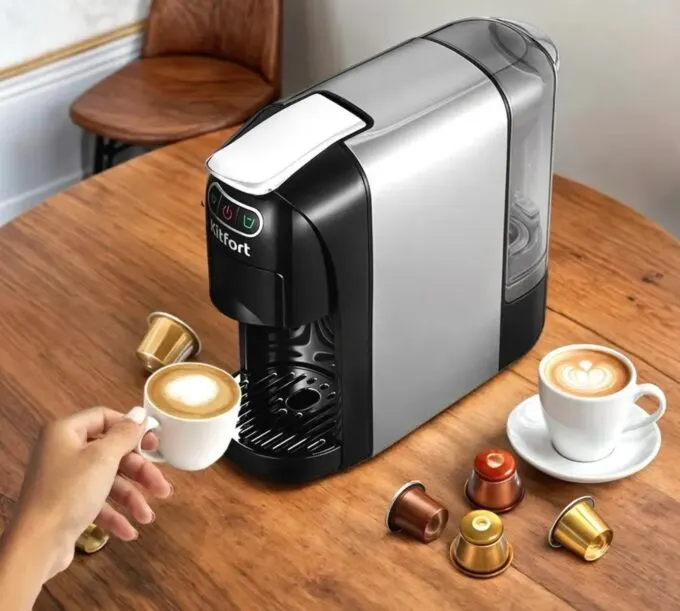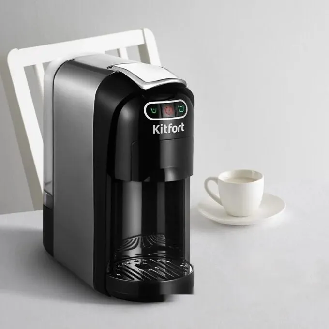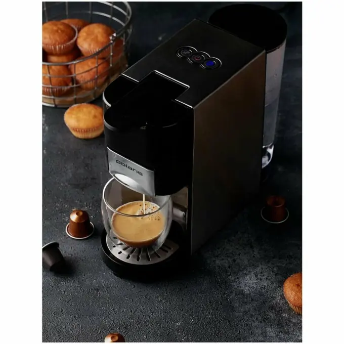 Эта машина с корпусом угловатого дизайна умеет готовить кофе из капсул Nespresso и Dolce Gusto — в комплекте есть соответствующие адаптеры. Есть отдельная кнопка для подачи горячей воды. Девайс получил сенсорное управление, резервуар на 0,8 литра и защиту от запуска без воды в баке.
