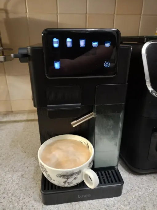Это машина умеет делать напитки из капсул Nespresso и Dolce Gusto, а также из молотого кофе. Причем можно покупать кофе в зернах — тут есть встроенная кофемолка. Также модель получила автоматический капучинатор. Есть сенсорная панель для управления, резервуар для воды имеет объем 1,7 литра.