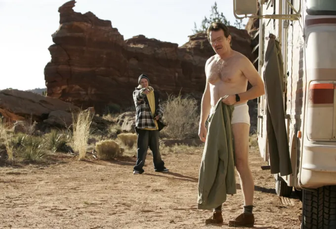 Мы знакомимся с Уолтером и понимаем его несчастное положение. Мы видим, что внутри у него сидит злость – это показано в сцене, где он наказывает парня, который издевается над его сыном. Мы видим, как ему в голову приходит отчаянная и в своем роде безумная идея. И все это заканчивается той самой сценой у трейлера в пустыне, где мистер Уайт стоит в нелепых белых трусах и с пистолетом. Идею с трусами, кстати, придумал сам Брайан Крэнстон, который сильно проникся своим персонажем. Да, первый сезон был слишком медленным для современности. Но! Первый эпизод – отдельный фильм со своей драматургией. И он прекрасен.