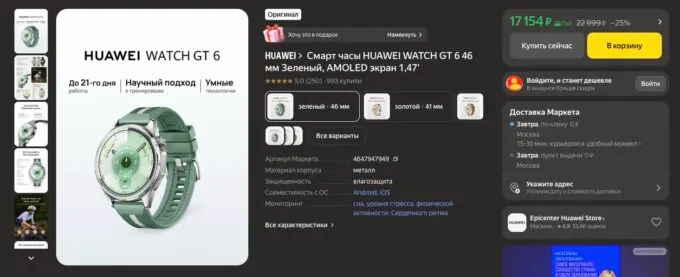 Прямо сейчас хитовые смарт-часы Huawei Watch GT 6 можно урвать на Яндекс Маркете всего за 17 154 рубля. Также не забывайте, что многие банки готовы отсыпать щедрый кэшбек за покупки на этой платформе.