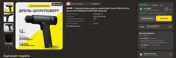 Прямо сейчас отличную дрель Xiaomi Mijia Electric Smart Drill можно купить на Яндекс Маркете со скидкой за 8116 рублей. Также не забывайте, что многие банки готовы отсыпать щедрый кэшбек за покупки на этой платформе.