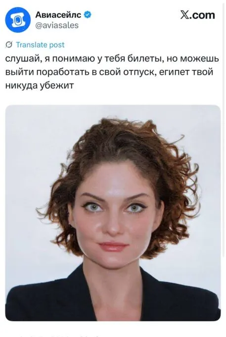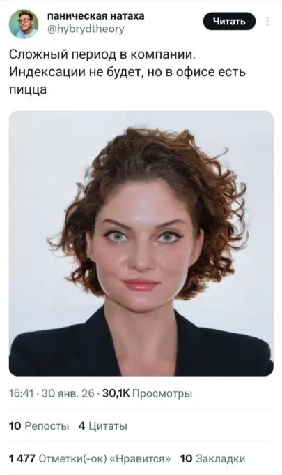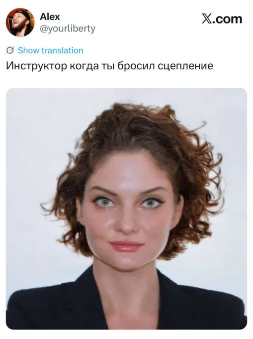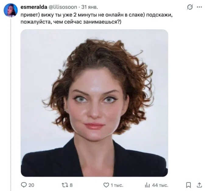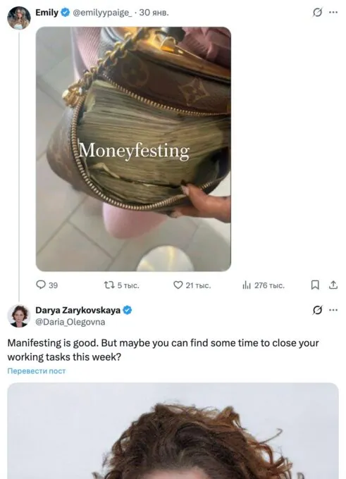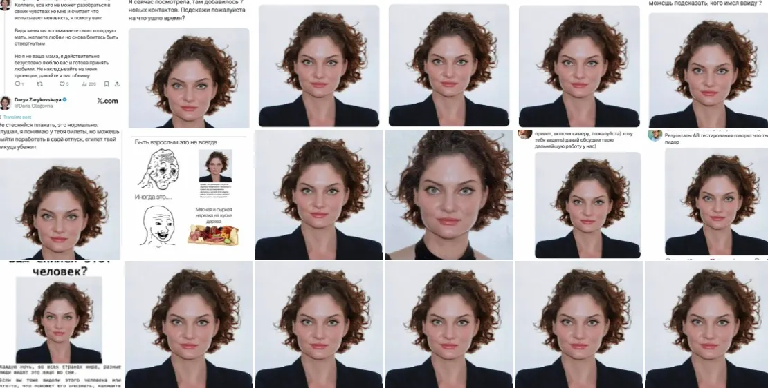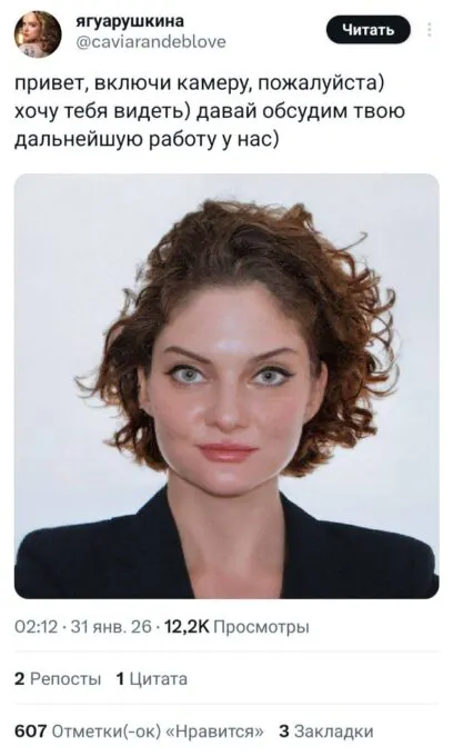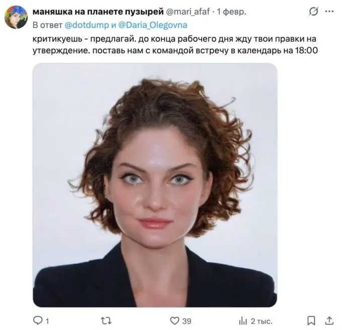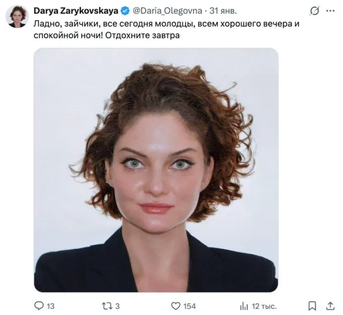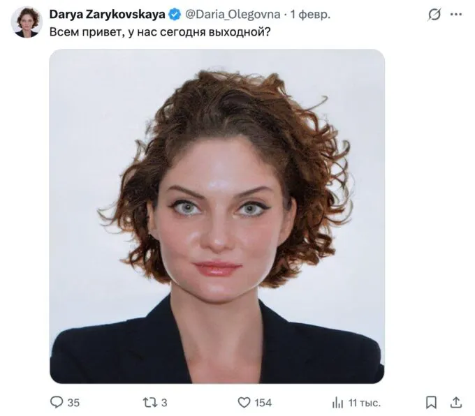Позже оказалось, что мем породила сама Зарыковская. Она выложила в свой телеграм-канал фотографию, которую ей сделали на визу в США. По словам Дарьи Олеговны, фото вызвало у нее смех — из-за «холодной стали в глазах». Предприниматель не только опубликовала снимок, но и подписала его в «офисном стиле».