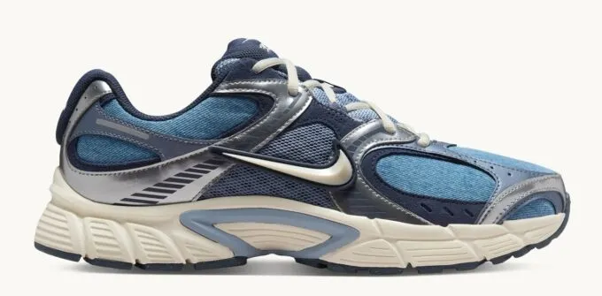 Начнем с синих V5 RNR – массивных кроссовок со спортивным силуэтом, отсылающим нас к ретро-обуви. Это брутальная, но легкая и воздухопроницаемая модель идеальна для демисезона. Цепкий рисунок протектора обеспечивает устойчивость, а амортизирующая подошва отвечает за комфорт во время ходьбы.