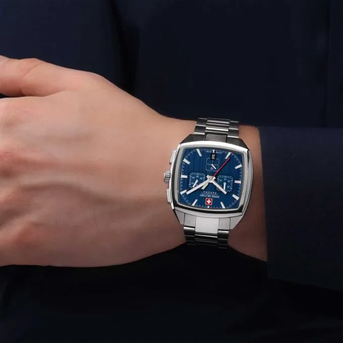 Более доступная, но не менее эффектная альтернатива для тех, кто хочет квадратный корпус и спортивный характер — Swiss Military Hanowa Starlight Chrono (SMWGI0004302). У это модели массивный корпус из нержавеющей стали и синий циферблат под сапфировым стеклом. В совокупности они смотрятся строго и дорого, но без лишней вычурности.