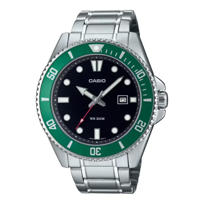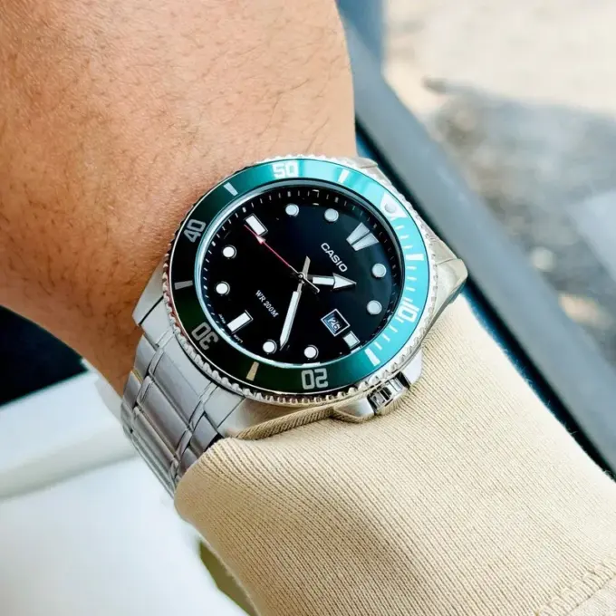 Первый лот предлагает солидный спортивный стиль и аквалангистскую водонепроницаемость. Casio Duro MDV-107D-3AV — часы в духе зелёных Rolex Submariner, которые коллекционеры называют Kermit. Но тут своя японская философия исполнения. Безель насыщенного зелёного цвета обрамляет крупный чёрный циферблат, который под минеральным стеклом смотрится глубоко и строго. Крупные метки легко читаются даже в сумерках, а стрелки с люминесцентным покрытием не теряются в темноте. Стальной корпус сделан добротно, с чёткими гранями и настоящим ощущением веса.