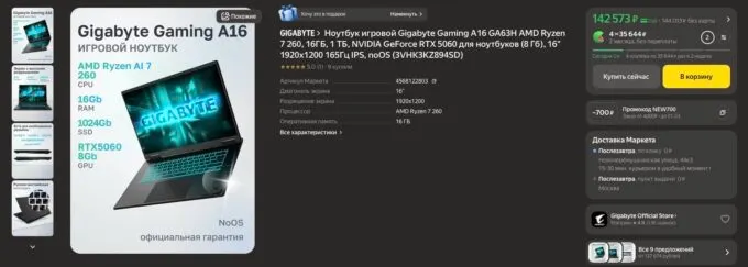 Прямо сейчас на Яндекс Маркете отличный геймерский ноутбук Gigabyte Gaming A16 GA63H можно урвать всего за 142 573 рублей. Также не забывайте, что с кэшбеками некоторых банков вы можете прилично сэкономить.