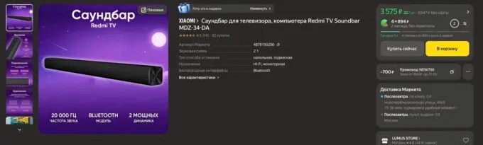 Сейчас на Яндекс Маркете топовую акустику Xiaomi Redmi TV Soundbar можно купить всего за 3575 рублей. А с кэшбеками некоторых банков он обойдётся дешевле.
