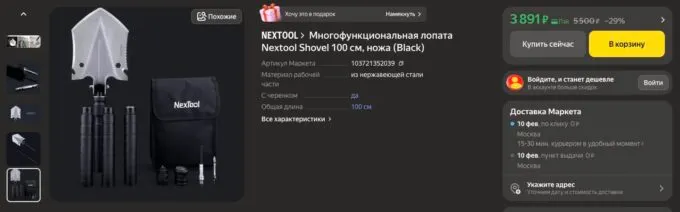 Прямо сейчас отличную лопату-мультитул Xiaomi NexTool Shovel можно купить на Яндекс Маркете всего за 3891 рубль. А с кэшбеком некоторых банков она обойдётся ещё дешевле.