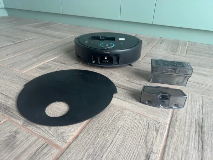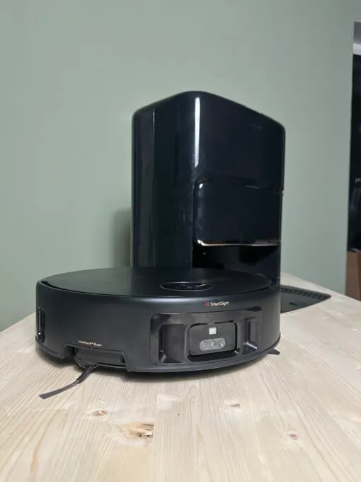 Гигантская база занимает половину места в коробке. На ней пылесос заряжается, меняет воду, оставляет сухой мусор и проводит в нише станции все свободное время. Как и у других подобных роботов, база имеет датчики и работает как маяк для пылесоса, по которому он ориентируется. Ее можно поставить в угол рядом с розеткой или загнать под стол — если позволяет высота столешницы.