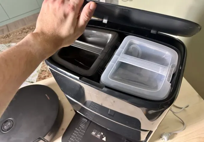 Большая станция освобождает руки. Она сама выгружает сухой мусор в пылесборник на 3,2 литра — его должно хватить примерно на 100 дней. Я крайне интенсивно гонял робота во время тестов, и у меня он забился за месяц. Есть два резервуара: для чистой воды – 4 л, для грязной – 3,5 л. Первый нужно время от времени наполнять водой, второй — сливать и мыть.