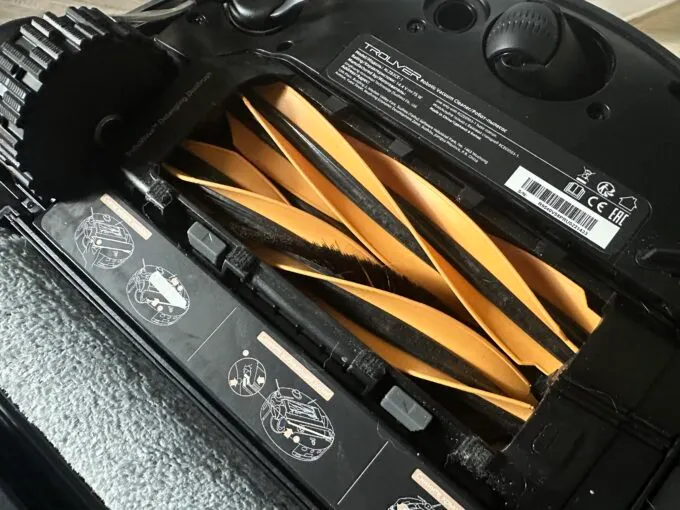 У этой модели Trouver основная щетка состоит из двух вращающихся турбощеток, которые помогают захватывать мусор. Сбоку находится трехлучевая щетка, которая умеет выдвигаться для выметания пыли с углов. По другую сторону от боковой щетки находится воронка — мягкий движок, который направляет мусор в сопло пылесоса.
