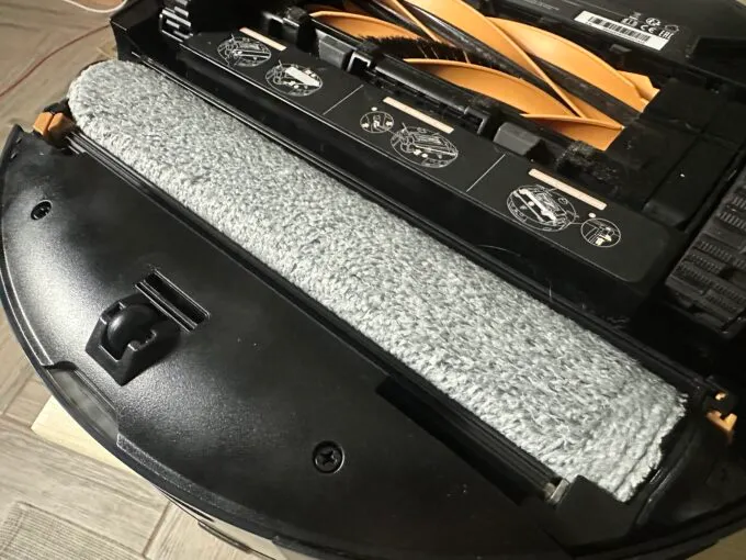 Модуль швабры — сложная деталь. Ролик крепится на держатель, который смачивается водой и вращается с большой скоростью. Подобную швабру я видел у вертикальных пылесосов. Она находится сзади и смачивает поверхность после того, как робот убрал с нее пыль. Распушивающий ролик не дает ворсинкам сбиться, а крышка швабры закрывается, когда робот проезжает над коврами или зонами, где запрещена влажная уборка. С отдельным датчиком пылесос сам понимает, когда находится над ковром (и помечает эту зону на карте). Он не только прячет швабру, но и увеличивает мощность всасывания.