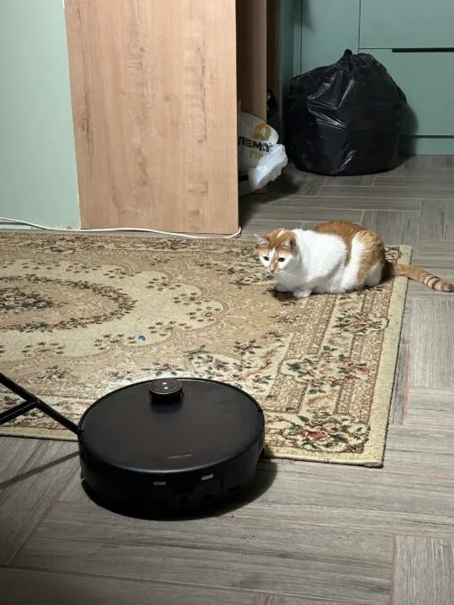 Машина оказалась эффективна и против мелкого мусора, и против крупного — фрагментов штукатурки, кошачьего корма, скатанных в клубок волос. На ровном полу робот прибирается очень хорошо — заметно, что он использует камеру и возвращается на уже пройденный участок, если видит остатки мусора.