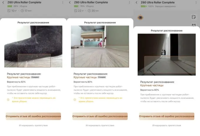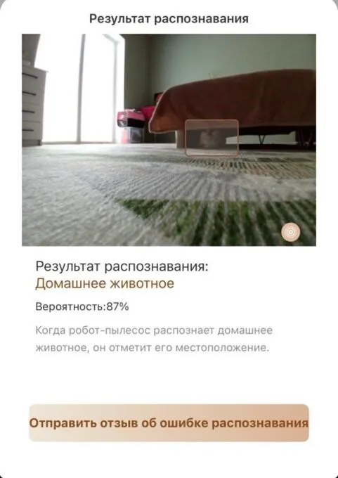 Лидар+камера — эффективный сетап. С дальномером робот определяет точное расстояние, но не понимает, что за объект перед ним. С камерой ИИ — всё наоборот. Во время работы он часто фотографирует предметы, которые заставили его изменить порядок уборки или на которые надо обратить внимание — ножки стола, пакеты, животных, крупную грязь. Снимки с подписью можно смотреть в приложении.