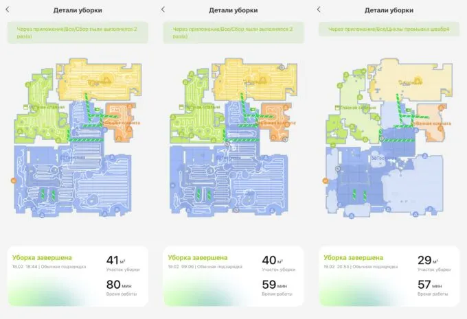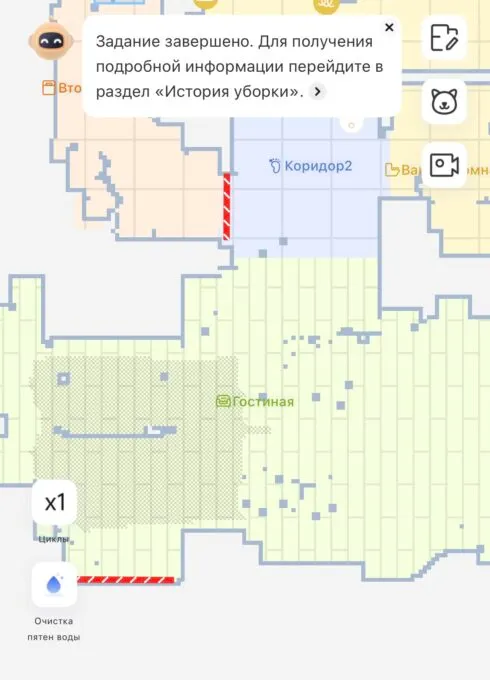 Фишка не работает, если запускать робота для уборки в конкретных комнатах или определенной зоне. Тогда Trouver сам оценит степень загрязнения, установит мощность всасывания и решит, как сильно нужно смачивать швабру. Например, последний раз робот стандартно убрался в чистой гостиной и дважды прошелся по спальной, так как увидел там следы от кофе и соуса: