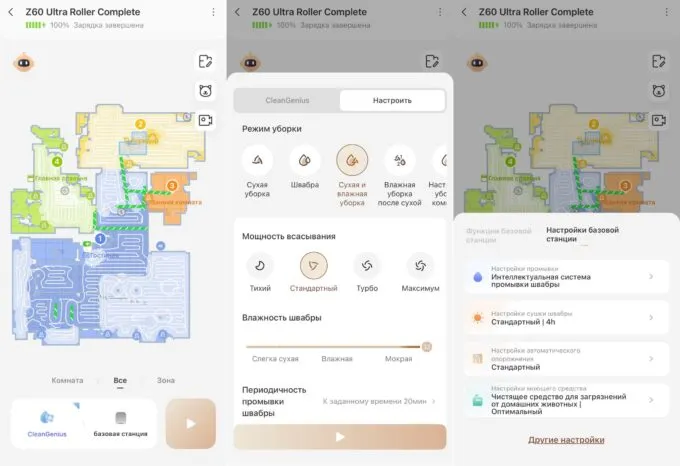Если вы пользовались роботами от Trouver или Dreame, то быстро разберетесь и с настройками этого пылесоса. Хотя специальных опций у модели Z60 Ultra Roller много. Но главное сводится к тому, что на основном экране отображаются карта помещения и настройки уборки.