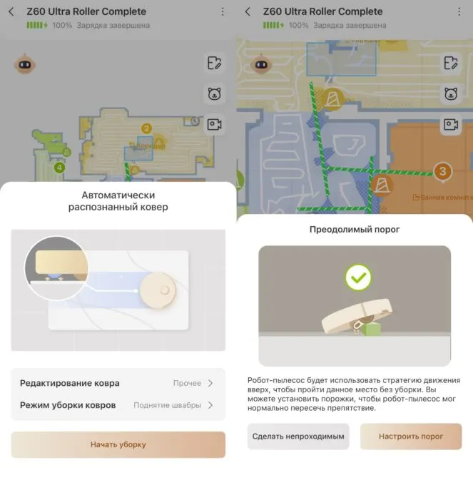 Пылесос отмечает ковры (у него есть специальный датчик), и делает это очень хорошо. Если тапнуть в зону ковра, то можно выбрать действие при следующем проходе — поднимать швабру, обходить его или вовсе игнорировать. Пороги тоже требуют действия пользователя — робот будет либо штурмовать их, либо объезжать. Это важно, если пылесос работает на втором этаже, и за порогом скрывается пропасть.