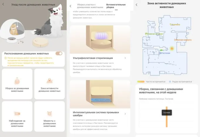 Камеру робота можно использовать для наблюдений за жилищем или процессом уборки. Это удобно, если вы далеко от дома — например, можно проверить, все ли в порядке с котом или собакой. На главном экране есть иконка «Уход после домашних животных» (да, перевод не идеальный). Из этого окна можно активировать камеру (и кататься по дому, издавая звуки лая собаки или мяуканье кошки), настроить опции уборки помещения с питомцем и посмотреть места на карте, где робот чаще всего встречается с животным.