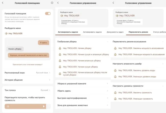 Пылесос Trouver имеет динамик и микрофон и поддержку голосового управления. В приложении можно посмотреть команды — их около 20 штук. Робота можно отправить убирать, заставить вернуться на базу, попросить промыть швабру или сообщить уровень заряда. Нужно лишь сказать Hey, Trouver, дождаться подтверждения и произнести команду. Если разговаривать с машиной в одной с ним или соседней комнате, то робот должен отлично все услышать. Но пылесос может не понять команду: например, нужно говорить именно «Останови задачу» (как указано в приложении), а не «Пауза». Вольные вариации он не понимает.