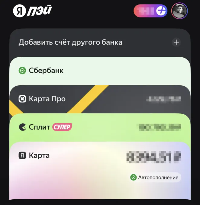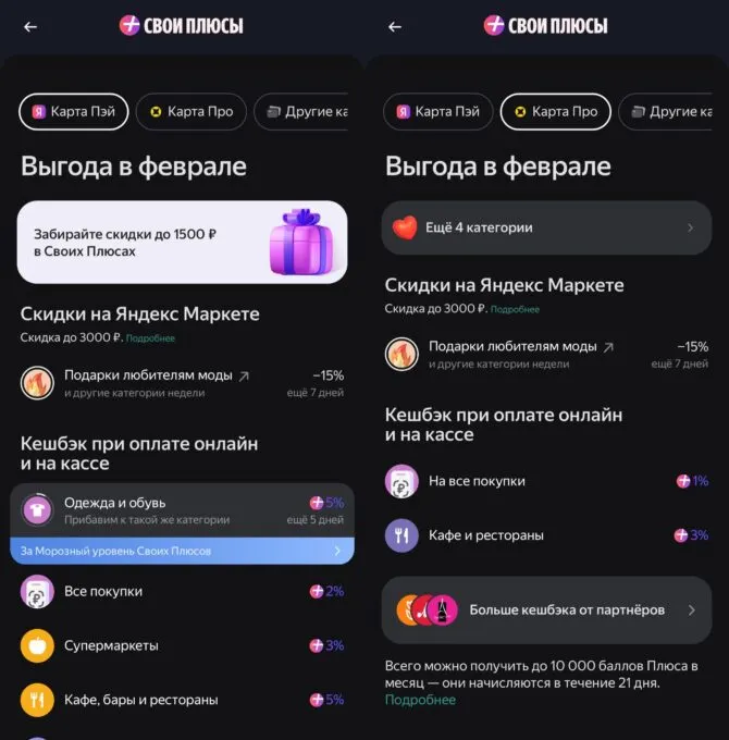 Вторая фишка — дополнительные категории кэшбека. Обычный юзер карты Яндекс Пэй имеет 5 категорий кэшбека каждый месяц. А владелец Про — еще шесть категорий. То есть в сумме получается 11! Переключаться между картами можно в приложении Пэй — вот пруф с кэшбеком: