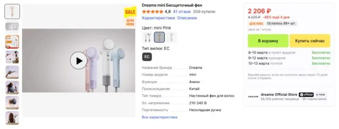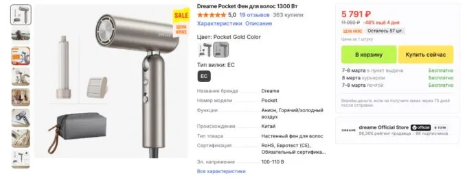 Итак, если вам хочется порадовать свою даму чем-то стильным и функциональным, стоит присмотреться к фенам Dreame. Тем более, прямо сейчас на распродаже доступны сразу три отличные модели — от компактной дорожной до продвинутого стайлера с кучей насадок в комплекте.
