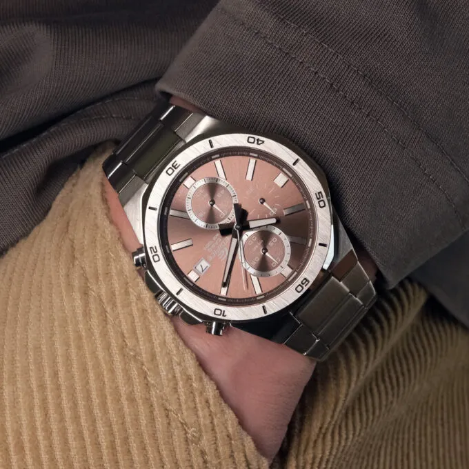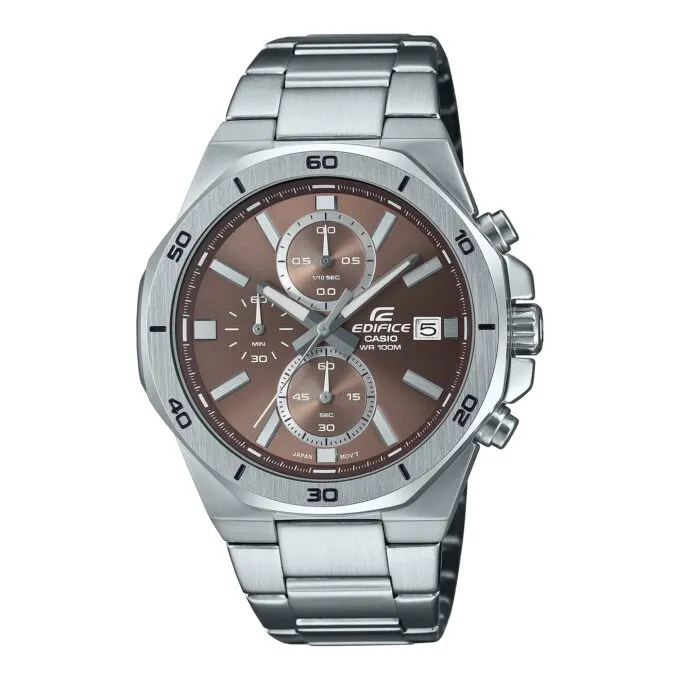 Casio Edifice EFV-640D-5A — уже более серьёзная модель для тех, кто хочет получить максимум функций и при этом сохранить строгий стиль. Эти часы выглядят премиально цены благодаря массивному стальному корпусу, аккуратному браслету и выразительному циферблату с эффектом Sunray. Стрелки получили необритовое покрытие, поэтому время легко считывается даже в полной темноте. В целом дизайн напоминает более дорогие спортивные хронографы по типу Royal Oak.