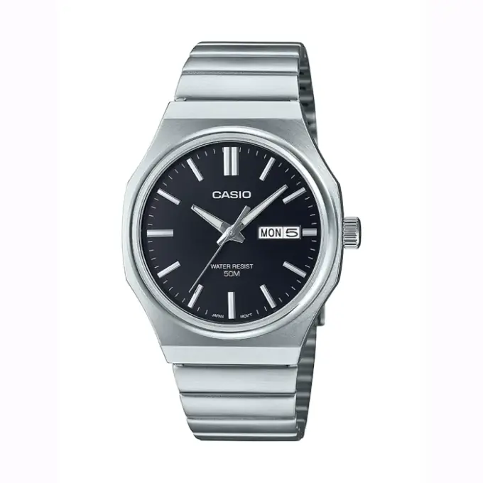Внутри Casio Collection MTP-E735D-1A установлен точный кварцевый механизм с аналоговой индикацией, который не требует сложного обслуживания. Батарейки обычно хватает примерно на три года работы. Циферблат защищён прочным минеральным стеклом, устойчивым к царапинам и мелким повреждениям. На нём также отображается текущая дата и день недели, что делает часы ещё практичнее в повседневной жизни. Дополняет всё влагозащита 50WR — можно спокойно мыть руки, попадать под дождь или даже плавать в бассейне.