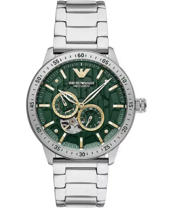 Emporio Armani Mario AR60053 — эффектная модель с итальянскими нотками для тех, кто любит часы с характером. Самая шикарная часть этих часиков — скелетонизированный зелёный циферблат, через который видно работу механизма. В сочетании со стальным корпусом и браслетом это выглядит действительно дорого и необычно.