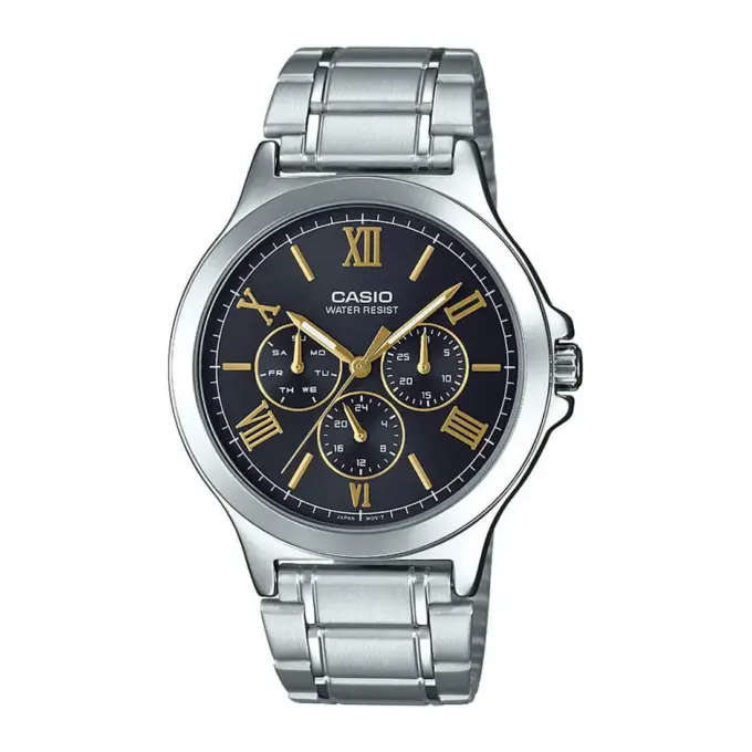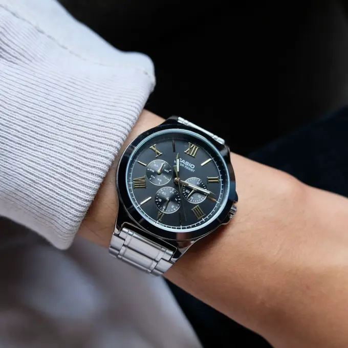 Casio Collection MTP-V300D-1A2UDF — эталон бюджетной классики. Модель выглядит значительно дороже своего прайса. Корпус и браслет выполнены из гипоаллергенной нержавеющей стали с комбинированной полировкой, что создает приятную игру света. Черный многофункциональный циферблат с тремя дополнительными шкалами напоминает приборную панель спорткара, а минеральное стекло надежно защищает стрелки с люминесцентным покрытием.